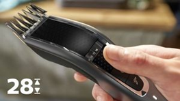 28 setari pentru lungime blocabile Tunde-ti parul exact la lungimea dorita cu 2 piepteni reglabilicare taie intre 3 mm si 28 mm in trepte de 1 mm si un pieptene pentru aspect nebarbierit de 2 mm. In plus, poti scoate pieptenele pentru un tuns scurt la 0,5 mm. |