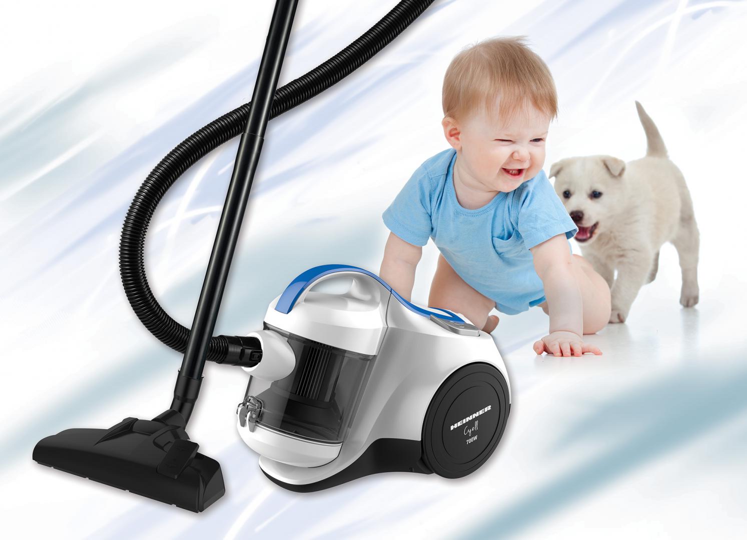 Aspiratorul fara sac Heinner Cyell HVC-MC700WB este un aparat eficient, dotat cu un sistem ciclonic si un filtru HEPA 10, ideal pentru curatarea eficienta a spatiilor.