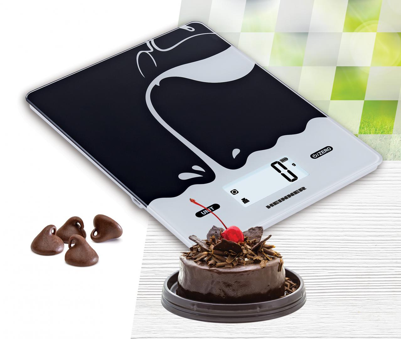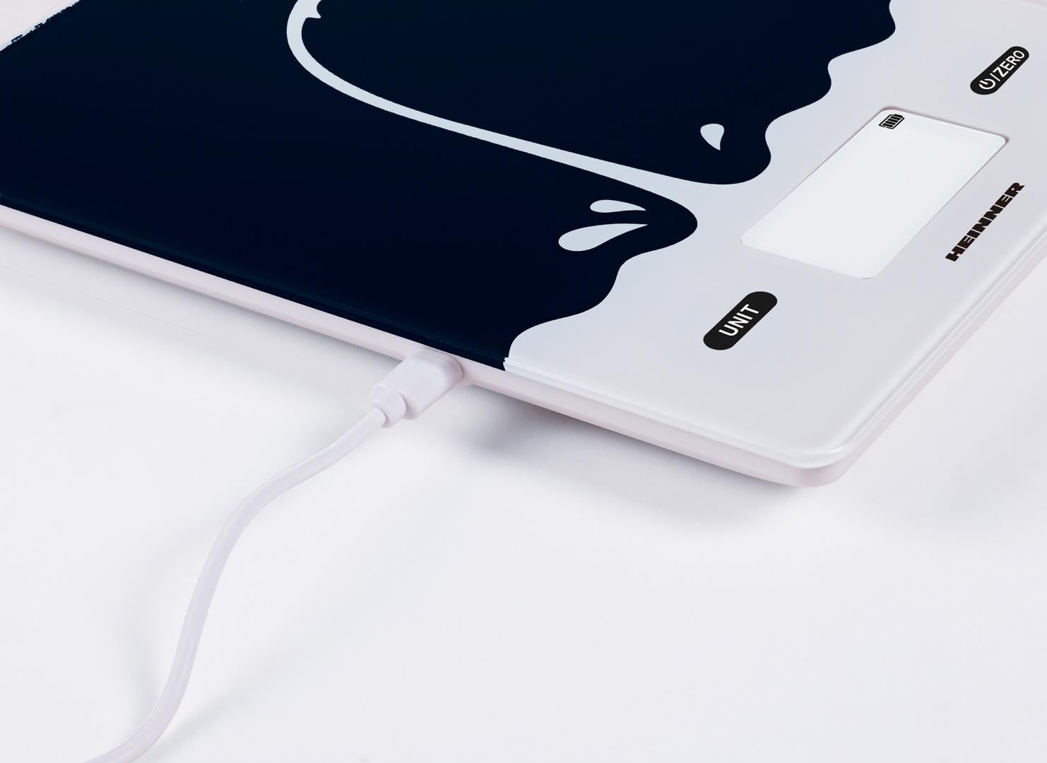 Cantar de bucatarie Heinner HKS-BK5USB, 5kg, sticla securizata 3mm, display lcd, control touch, gradare: 1g, functie Cantarire lichide, incarcare type-c, acumulator li: 3.7v