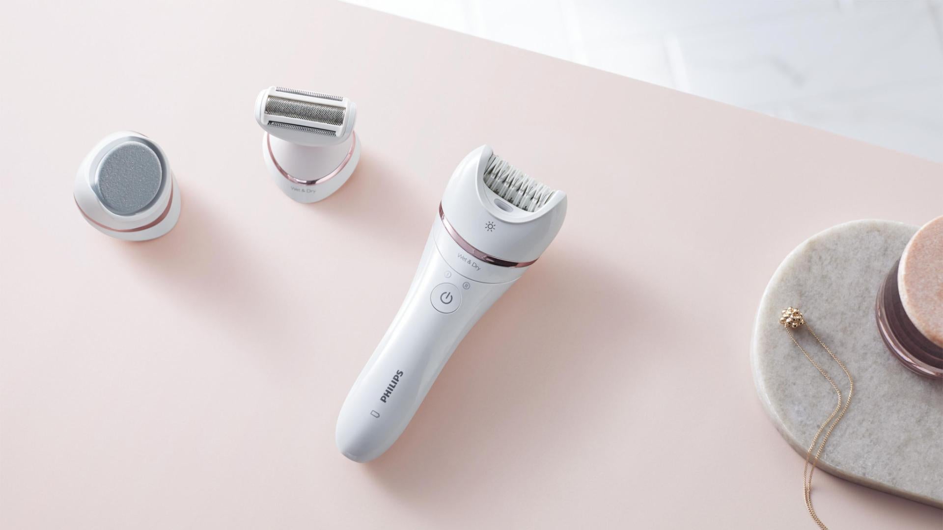 Epilator umed si uscat Philips Seria 8000 BRE730/10, 7 accesorii, 32 pensete, utilizare fara fir, 2 setari viteza, opti-light, discuri ceramice, Argintiu