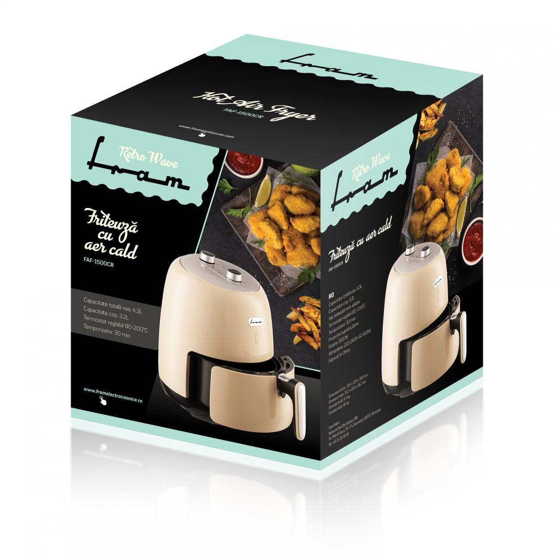 Friteuza cu aer cald FRAM Airfryer FAF-1500CR, gatire fara ulei, 1500W, capacitate cos 3.2L, vas detasabil anti-adeziv, termostat reglabil 80-200˚C, timer 30 min, crem