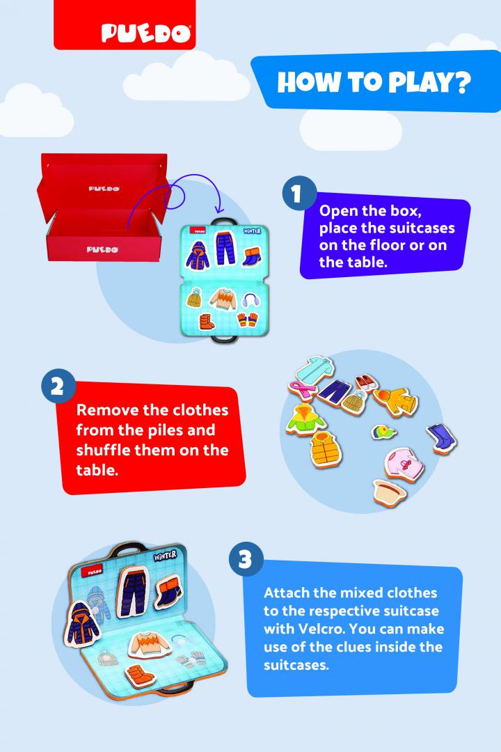Imprastiati  articole vestimentare astfel incat sa le vizualizati. Apoi, distribuiti-le corespunzator in valize, conform celor 4 anotimpuri. Acest joc ajuta copilul sa isi dezvolte abilitatile de potrivire vizuala si sa invete relatia dintre anotimpuri si tipurile de articole de imbracaminte corespunzatoare. Poate fi jucat de catre 1 jucator sau mai multi jucatori.