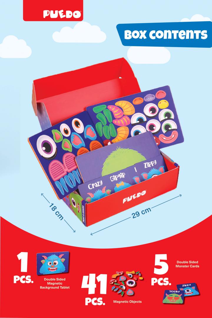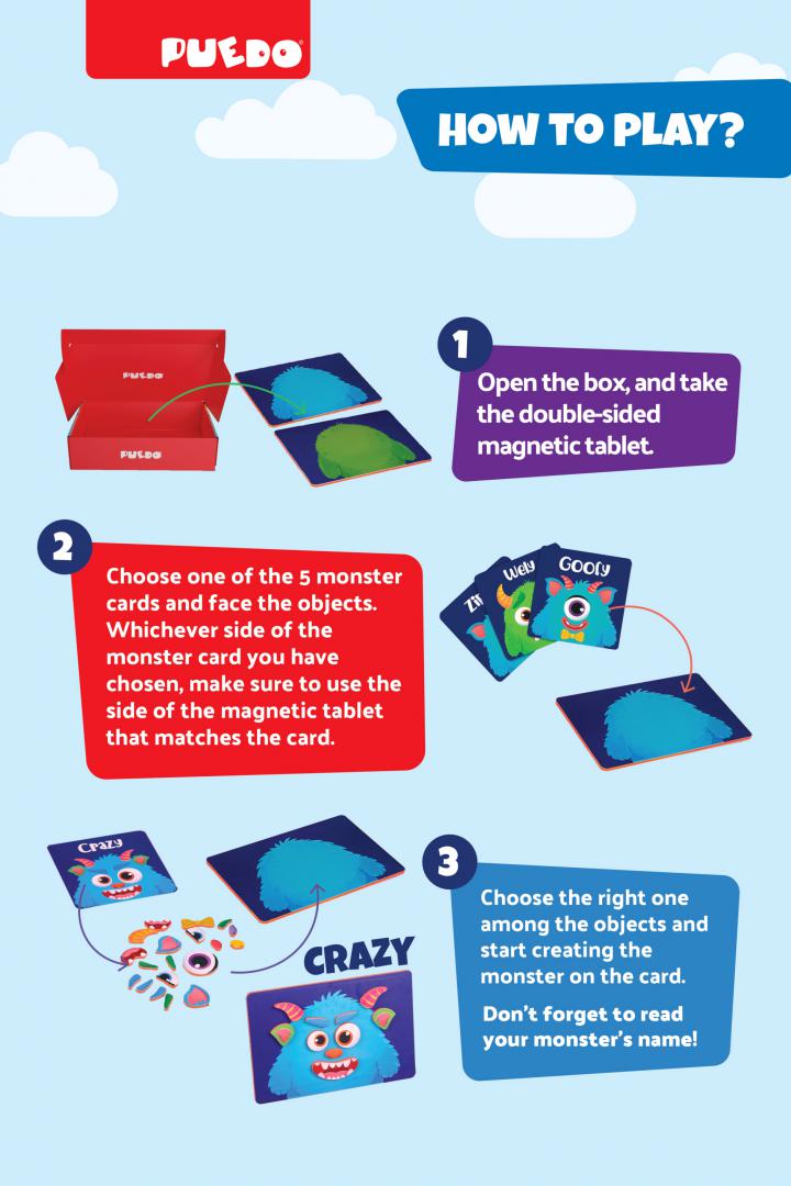 Mod de joaca: Copiii incerca sa construiasca, folosind plansa, diversi monstri amuzanti cu ajutorul obiectelor magnetice precum: gura, nasul, ochii si urechile. Copiii vor invata astfel diversele expresii faciale si isi vor imbunati abilitatile manuale. Copiii, pot, de asemenea, sa creeze alte forme, independente de imaginile de pe carduri, folosindu-si imaginatia.