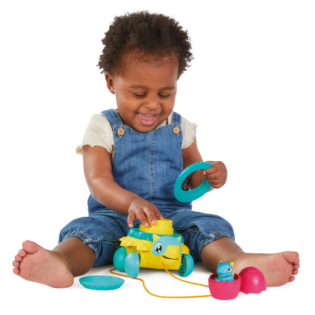 Ankylosaurusul colorat are patru inele diferite care se împletesc dacă sunt aruncate deasupra în ordinea corectă. Să faci o plimbare cu bebelușul dino, proaspăt scost din ou: scutură-l pentru a-i auzi mârâitul drăguț! Trageți-l pe dino pentru a încuraja jocul de târât sau când micuțul dvs. este în picioare, îl poate scoate la plimbare. Privește și ascultă în timp ce merge zguduit și clătin, roțile clacănind și clacănind, în timp ce coada ei plină de mărgele.